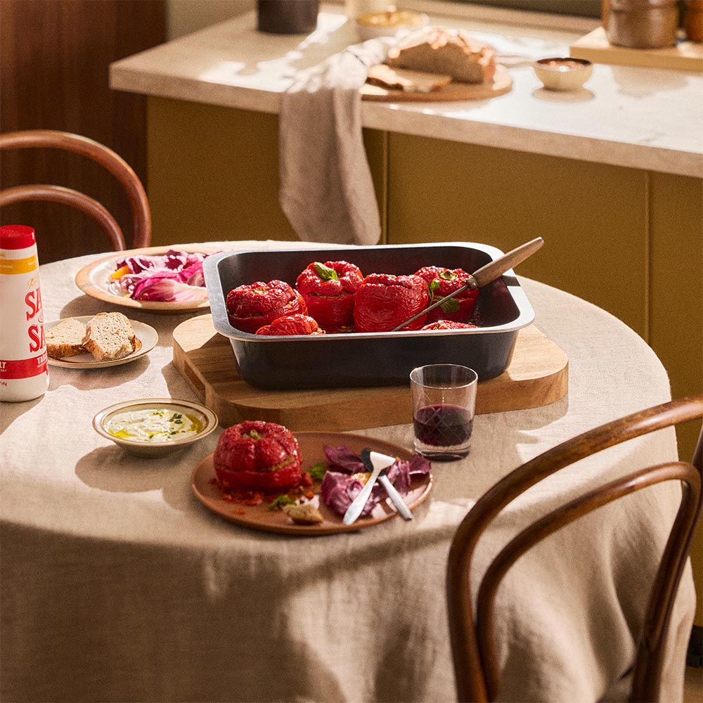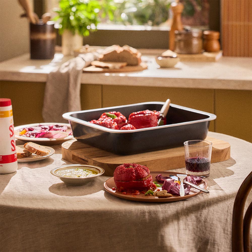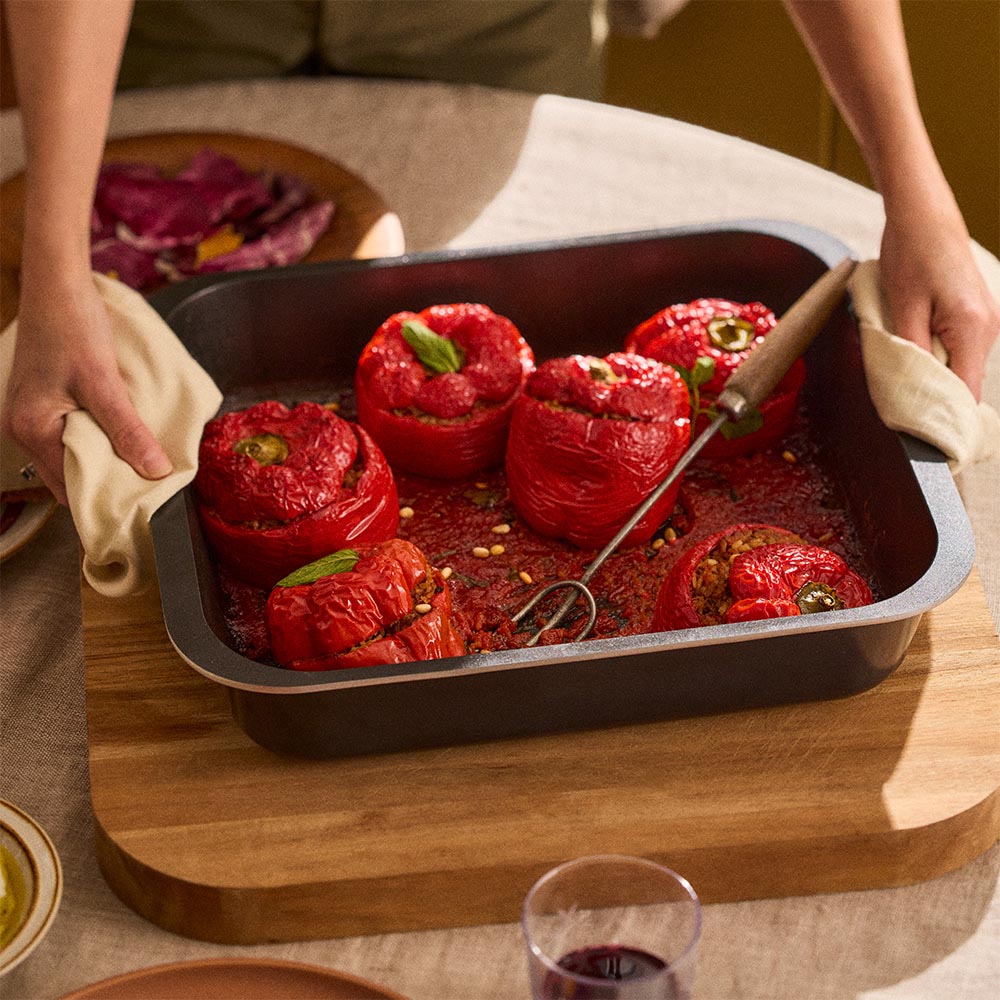 With high side walls to reduce spattering, this 40cm roaster is designed to roast meats, poultry and vegetables to perfection.